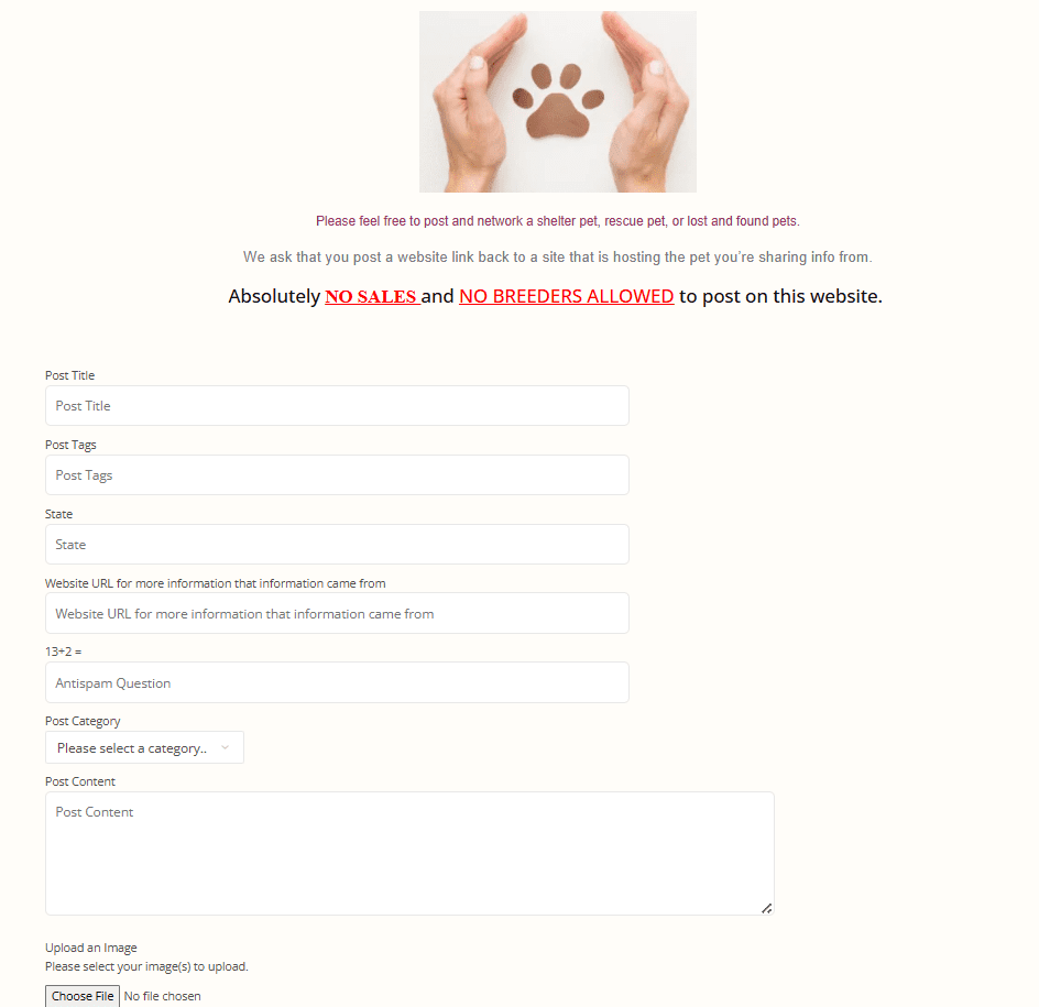 Click on “PET NEEDING HOMES” from the main menu to see the pet listings. Underneath that button on the menu, there will be a “POST A PET” button. Click on that, and it will ask various questions. Please give credit to websites you may be getting your information from.